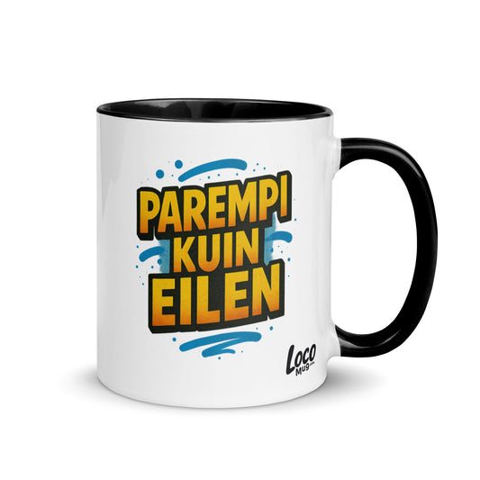 “Parempi kuin eilen” Mug with Color Inside – Finnish Focus, Caffeinated Progress